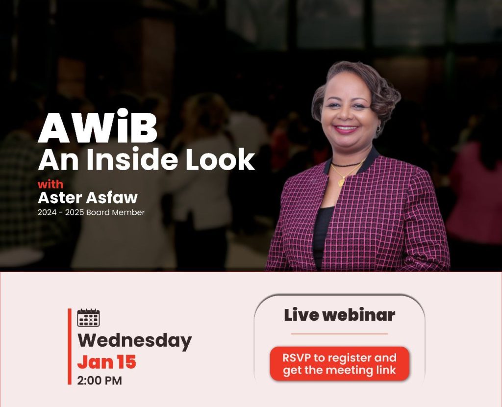 We invite potential members to AWiB: An Inside Look with Aster Asfaw on a Google Meet Webinar to introduce AWiB and the benefits & opportunities of membership.
