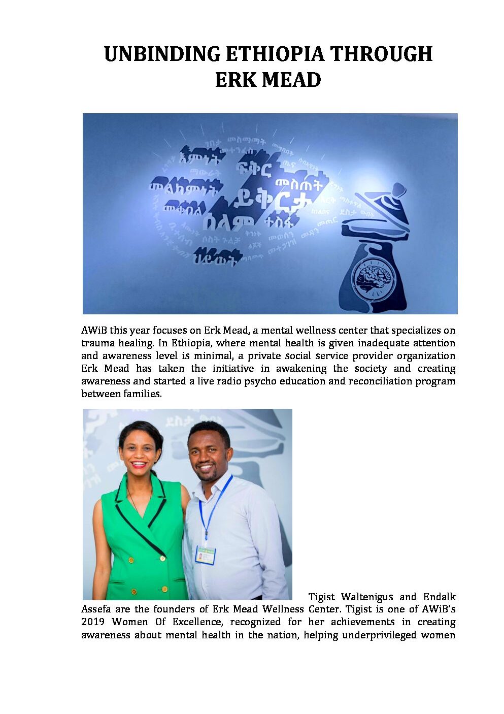 Tigist Waltenigus and Endalk Assefa are the founders of Erk Mead Wellness Center. Tigist is one of AWiB’s 2019 Women Of Excellence, recognized for her achievements in creating awareness about mental health in the nation, helping underprivileged women get treatment and working tirelessly throughout Ethiopia to uncover the trauma and help a society break free from the pain through Erk Mead.