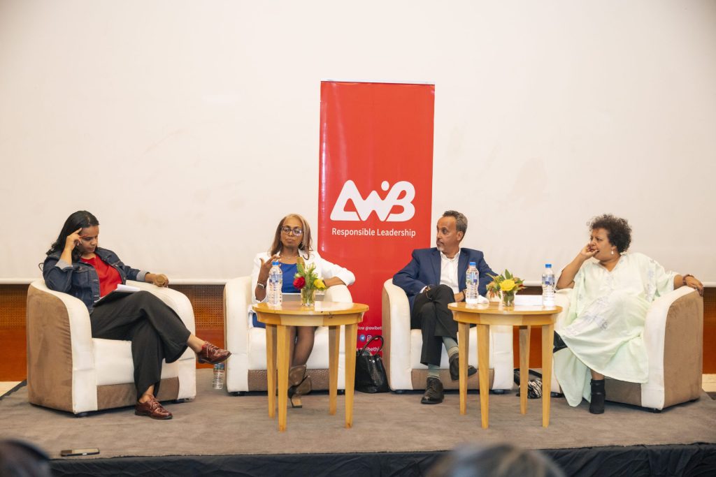 As the evening unfolded, AWiB’s 2025 President, Jemila Hamid, took the stage and welcomed the guests. She reminded the audience that AWiB gatherings are more than discussions; they are spaces for reflection, inspiration, and renewal. As is customary at AWiB gatherings Jemila, she then invited members who were provided with tables to showcase products and services. A valued membership perk that highlights AWiB’s culture of collaboration and support. The members were Rihana Abdulkadir from an AI-powered real estate agent platform, Bezawit Admasu from Bezad Solutions, Yodit Gidey from GG Enterprise, Maria Mamo from Yaya Design, and Meskerem Kassahun from Ultra life.