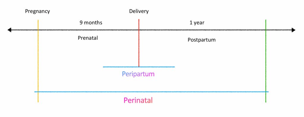 Dr. Mahlet then explained what Perinatal Depression means. Perinatal depression is a mood disorder that affects individuals during pregnancy or within 1 year after childbirth. She noted it includes the more widely known term Postpartum Depression, which can happen after a woman gives birth but also the less known term, prenatal depression, which can happen from the time a woman gets pregant. See the timeline on the image below.